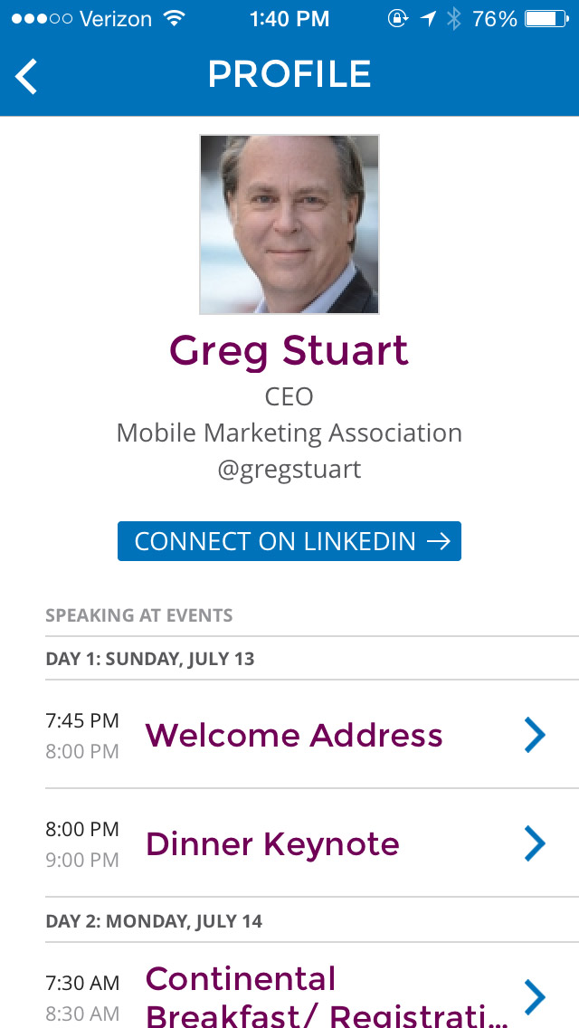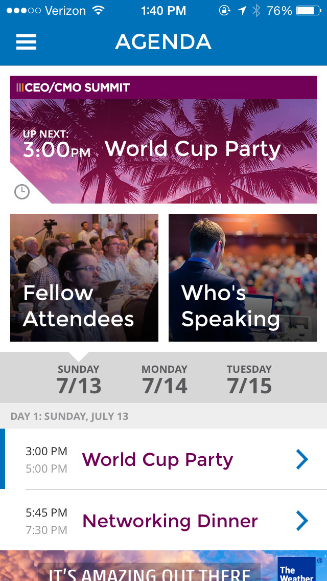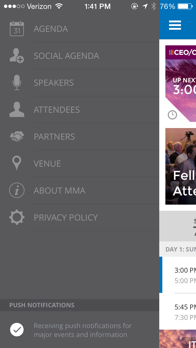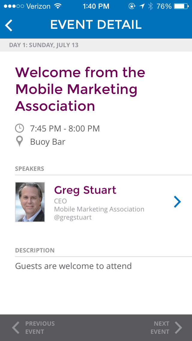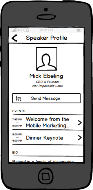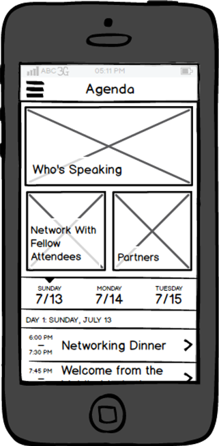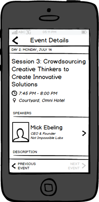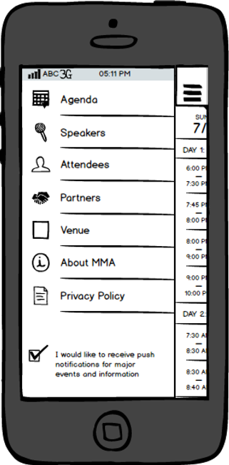 The MMA Events app was a guide for the MMA's numerous conferences. During an active conference, users could view the week's events, find speakers or sponsors and the events they were hosting, as well view a list of the other attendees. I was responsible for wireframing this project, organizing its many moving parts.