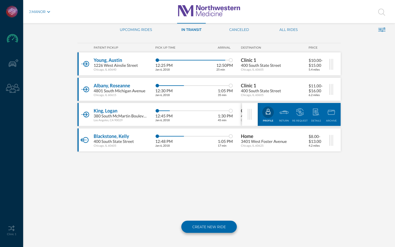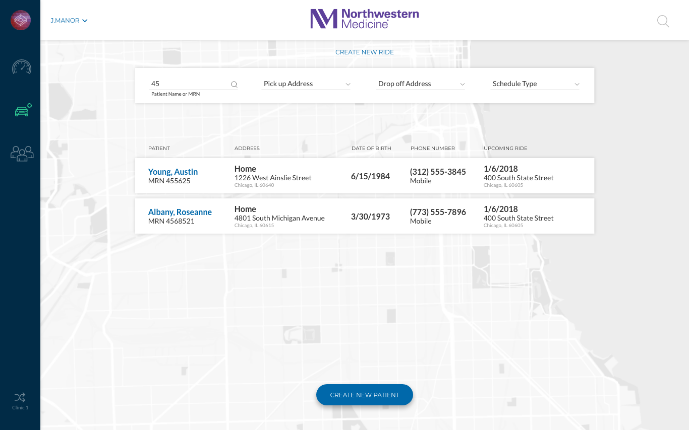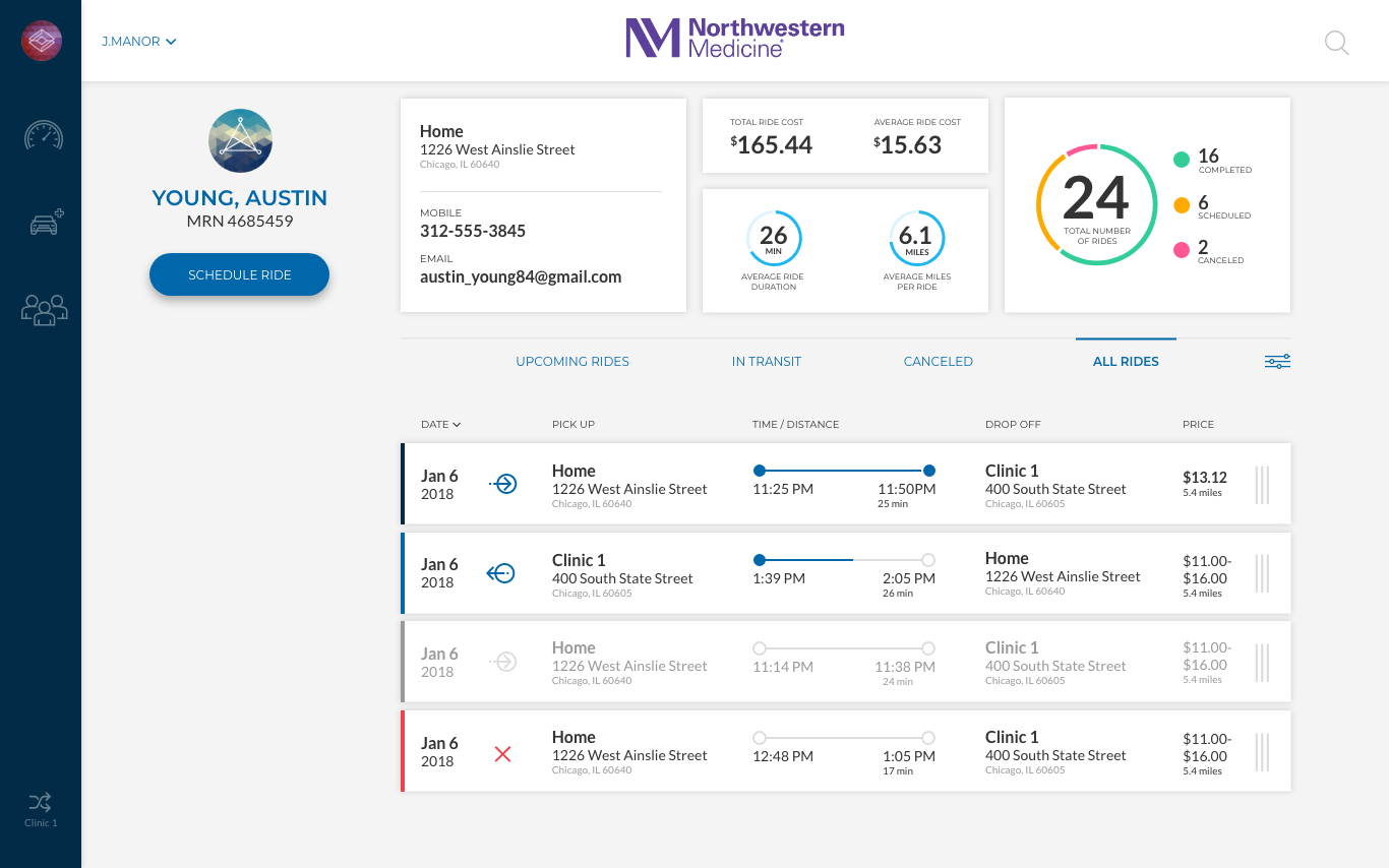On the platform, a user can see upcoming, in progress or past rides, schedule a new ride, or view a patient's profile with their contact information and history of their rides.